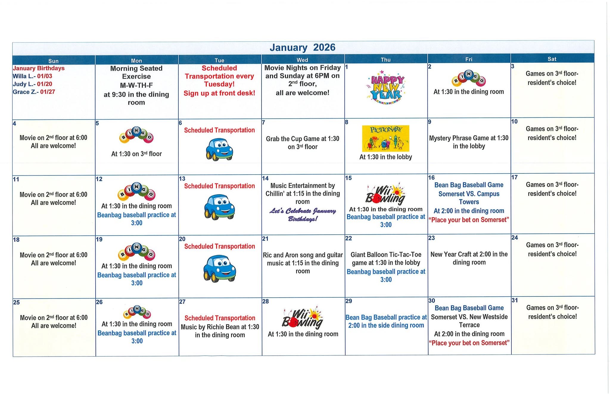 Calendar Senior Living Activities January 2026